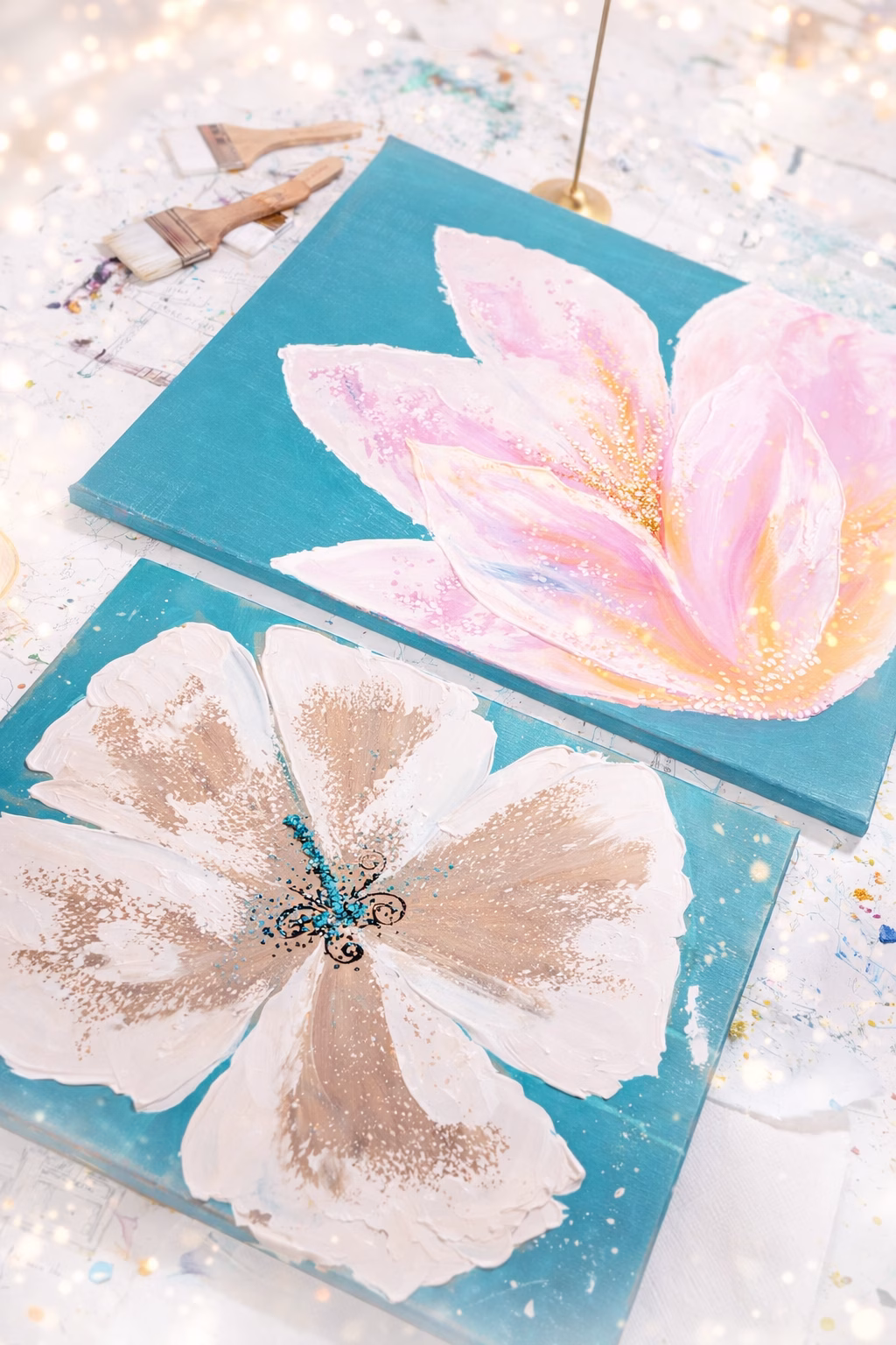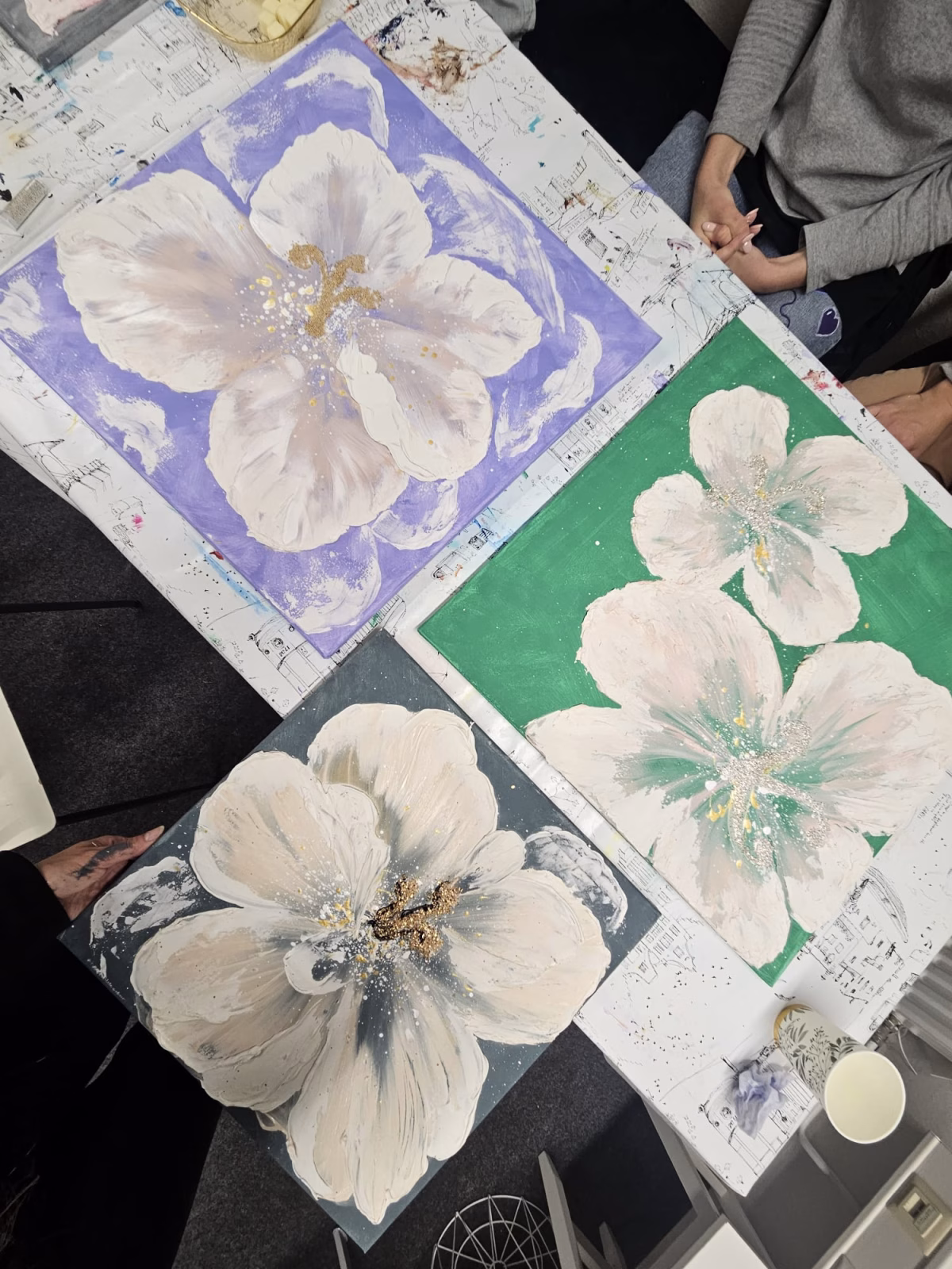 Wir werden große abstrakte Blumen mit einem Malerspachtel, Strukturpaste und Acrylfarben gestalten.
