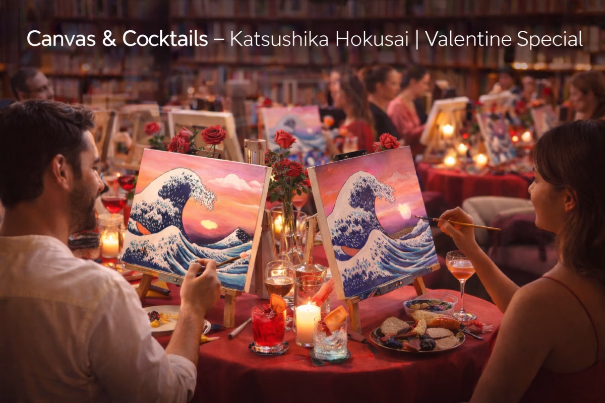 Inspiriert von Hokusai entsteht euer eigenes Kunstwerk auf Leinwand – begleitet von spanischen Tapas und Cocktails für einen Abend voller mediterraner Romantik.