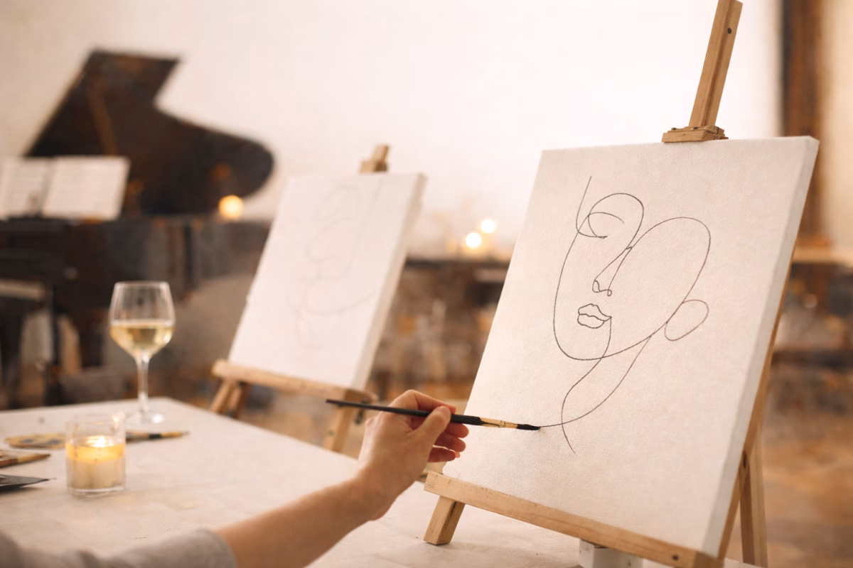 Wir beginnen mit sanften Atem- und Erdungsübungen, bevor wir in eine geführte One-Line-Praxis eintauchen: Ihr gestaltet ein ganzes Bild, ohne den Pinsel abzusetzen.