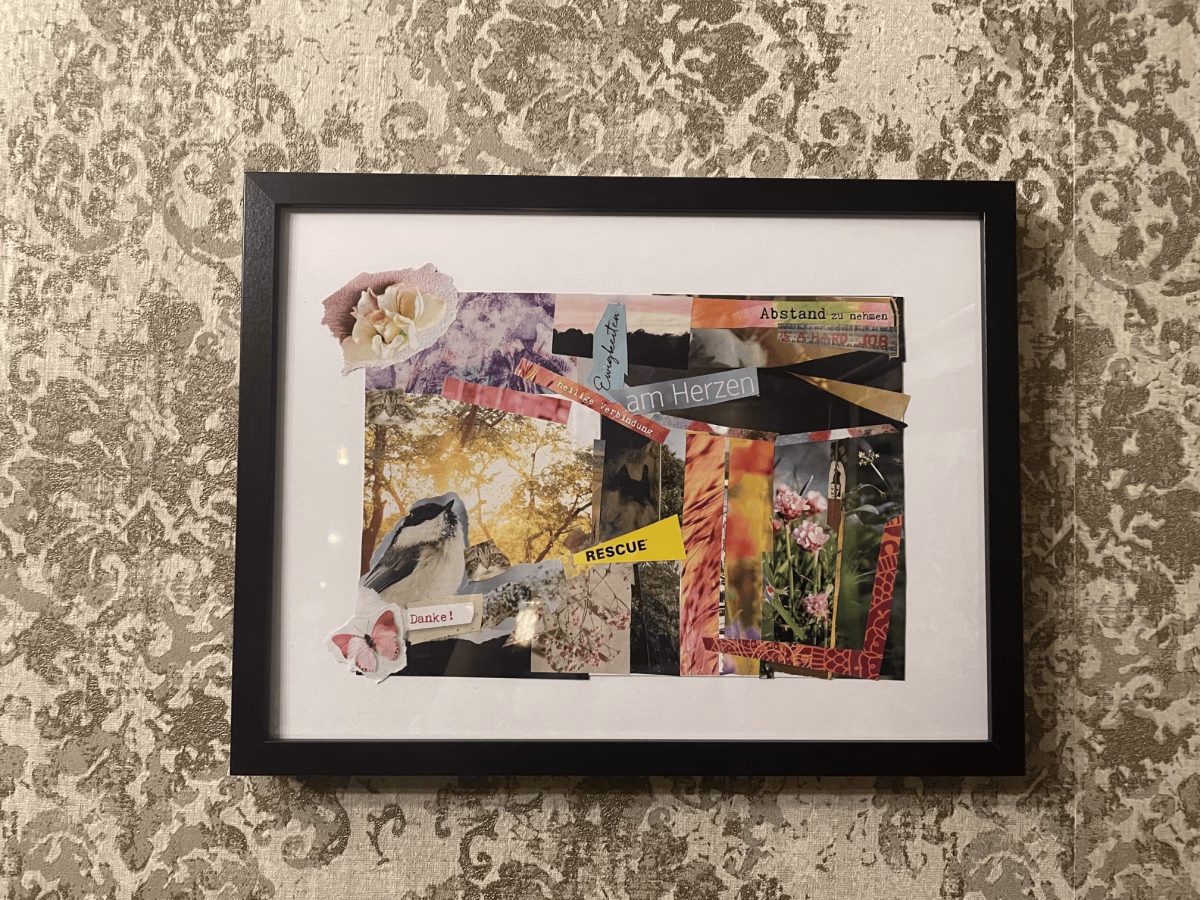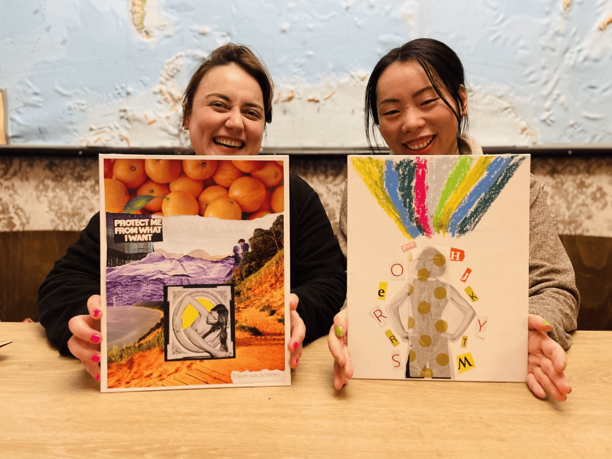 In 2 Stunden stehen dir Magazine, Bücher, Zeitungen, Farben, Pinsel, Scheren, Kleber und jede Menge Inspiration zur Verfügung. Dazu gibt’s einen Drink deiner Wahl an der Bar sowie Wasser und Snacks. Unsere künstlerische Begleitung unterstützt dich, wenn du Input möchtest – oder lässt dir Raum zum freien Flow.