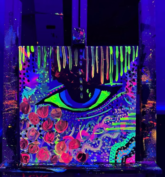 Tauche ein in eine magische Atmosphäre aus Schwarzlicht, Musik und leuchtender Farbe. In entspannter Stimmung, mit einem Drink in der Hand, entsteht dein ganz persönliches Kunstwerk auf einer 30×40 cm Leinwand.