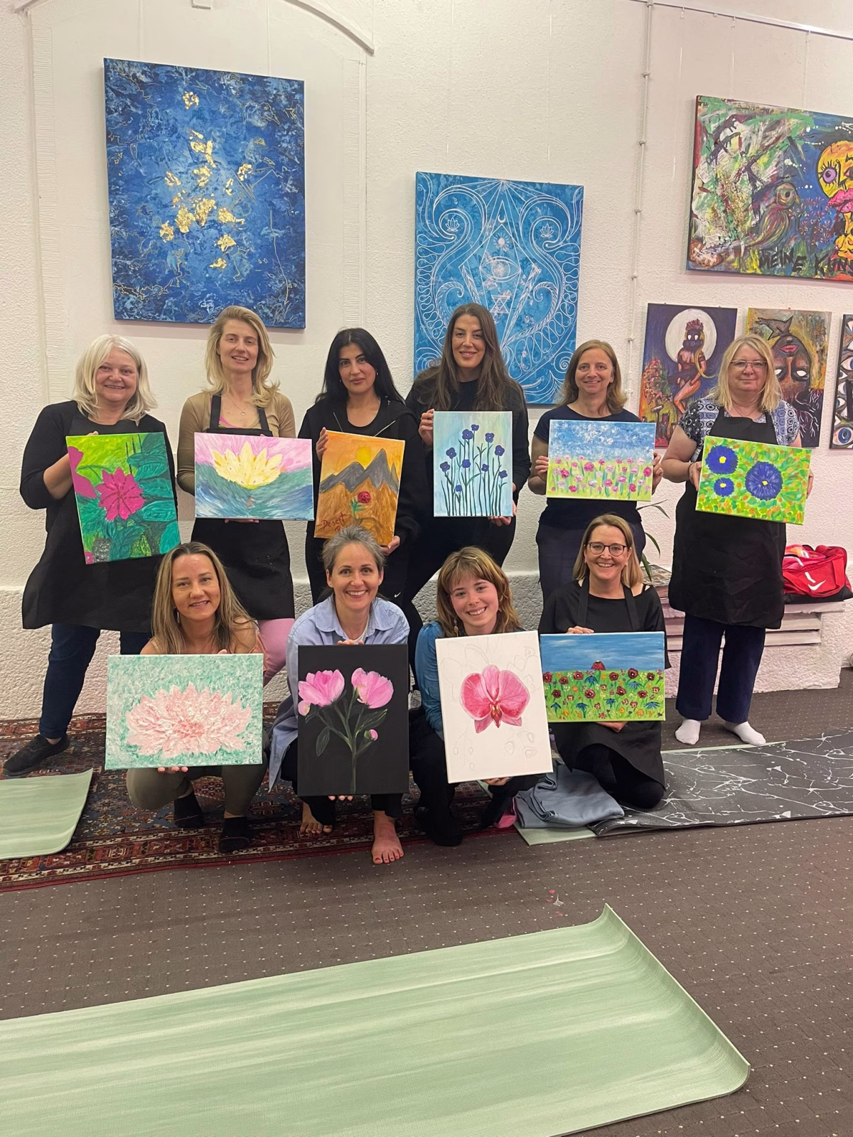 Bei Yoga meets Art starten wir mit einer ca. 60-minütigen Yoga-Session im Atelier, getragen von einer ruhigen, inspirierenden Atmosphäre. Das Yoga öffnet dich sanft, bringt dich in Balance und bereitet dich innerlich auf den kreativen Prozess vor. Die Session ist für alle Level geeignet – auch für Anfängerinnen.