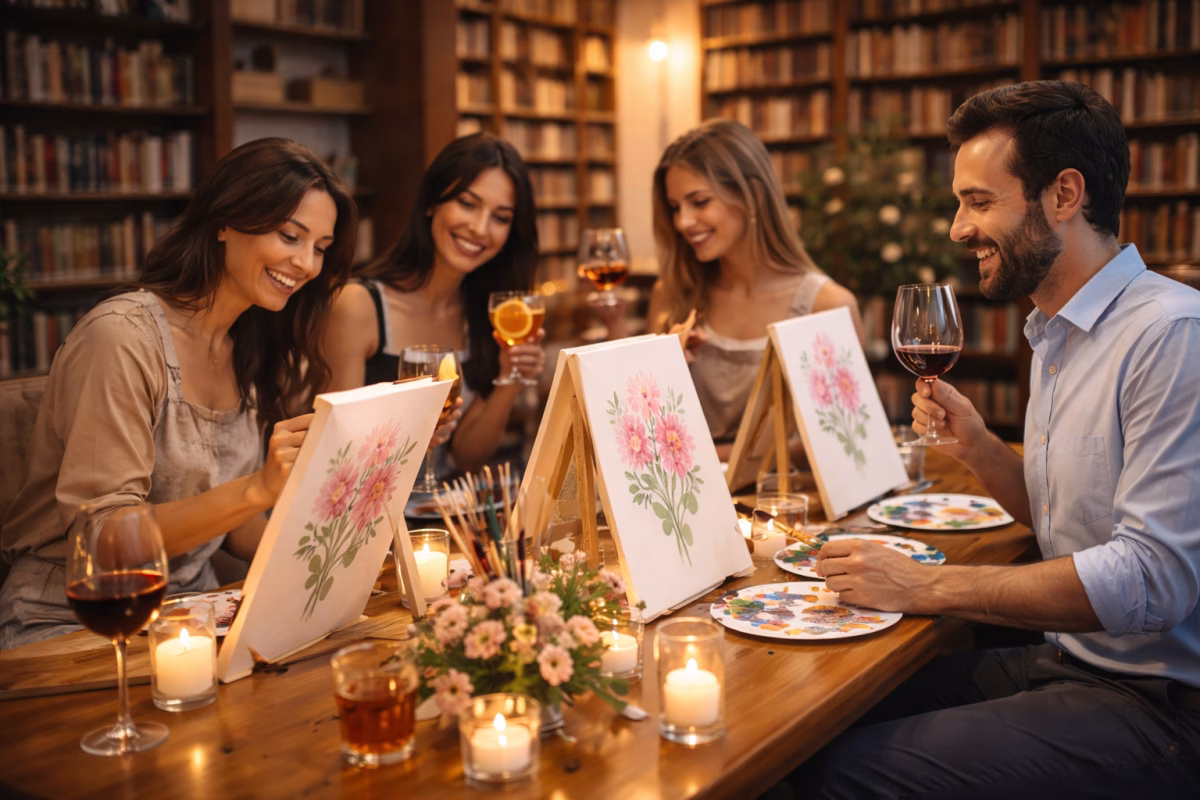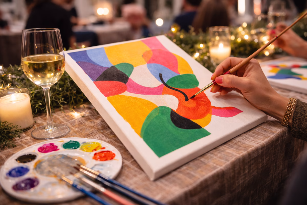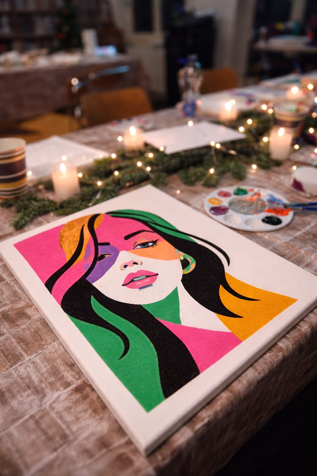 Ihr kommt an, stoßt gemeinsam an und taucht in eine entspannte, kreative Atmosphäre ein, in der alles darf und nichts perfekt sein muss. Farben, Musik, Gespräche, Lachen, ein Glas Wein in der Hand – und plötzlich entsteht Kunst, ganz von selbst.