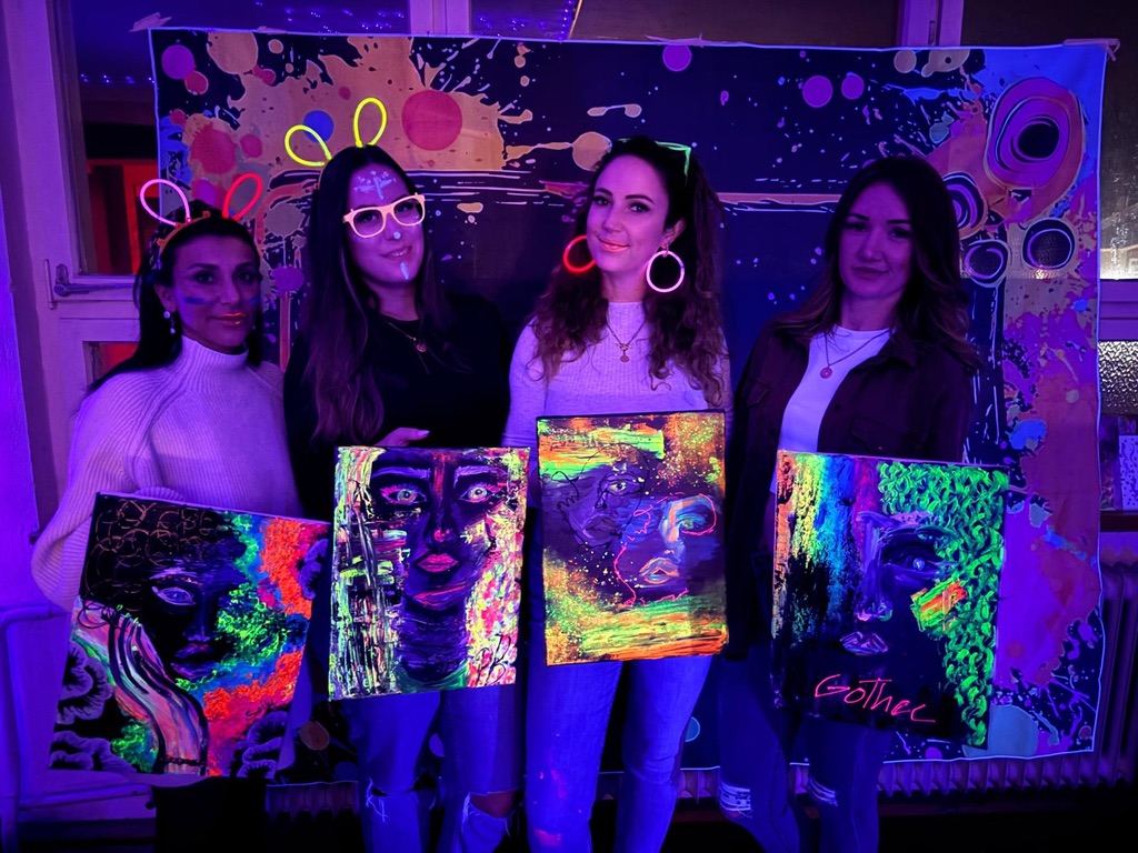 Unsere Paint in the Dark Sessions sind das perfekte Erlebnis für Gruppen, die etwas Besonderes suchen – ob Junggesellinnenabschied, Geburtstag, Teamevent oder Freundeskreis.