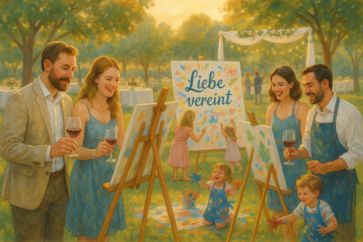 Begrüßt eure Gäste mit einer besonderen Aktion: Beim Sektempfang steht eine große Leinwand bereit, auf der sich Freunde und Familie mit kleinen Botschaften, Zeichnungen oder Farbakzenten verewigen können. So entsteht im Laufe des Abends ein einzigartiges Gemeinschaftskunstwerk – ein lebendiges Andenken an euren großen Tag.